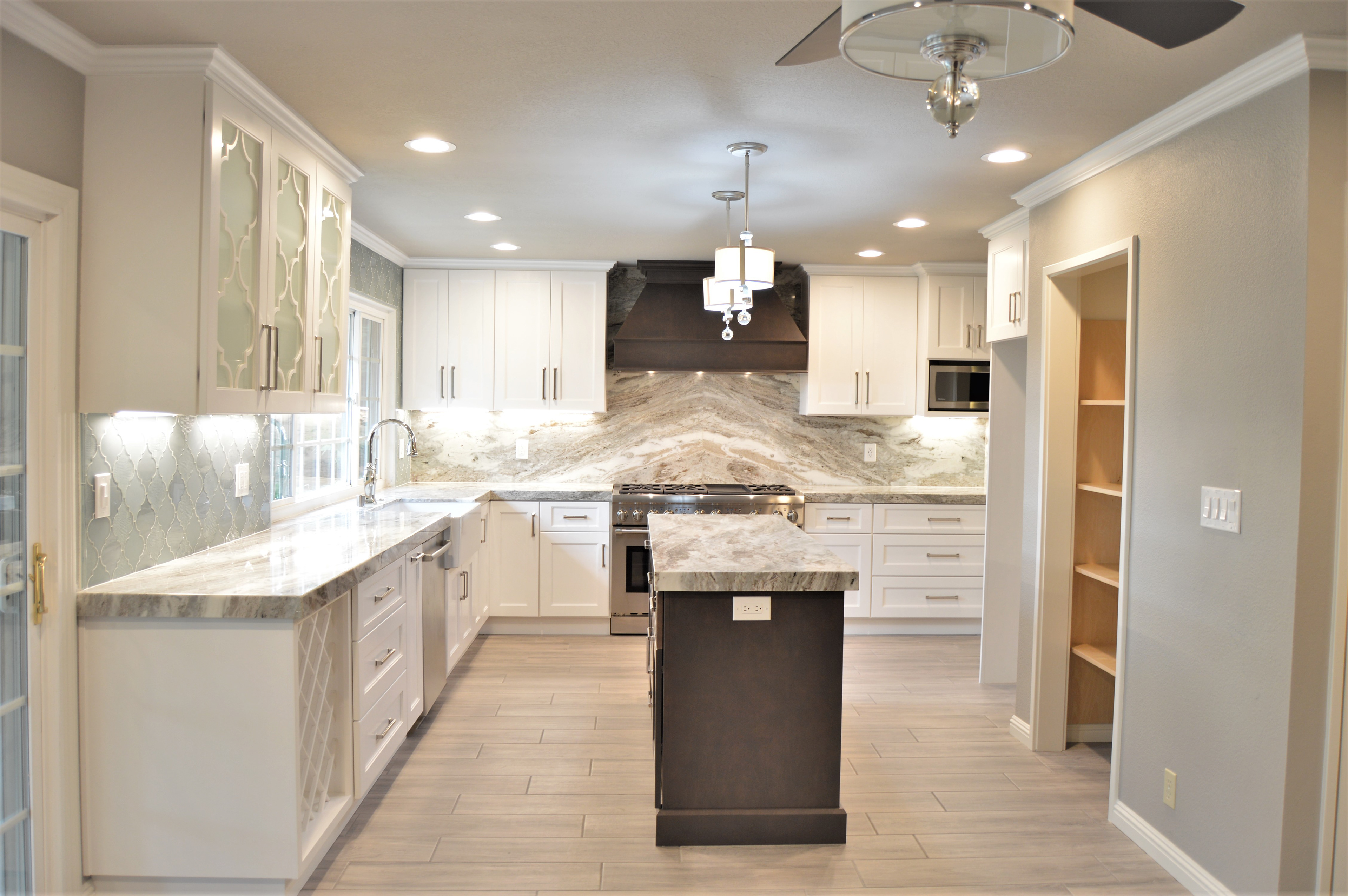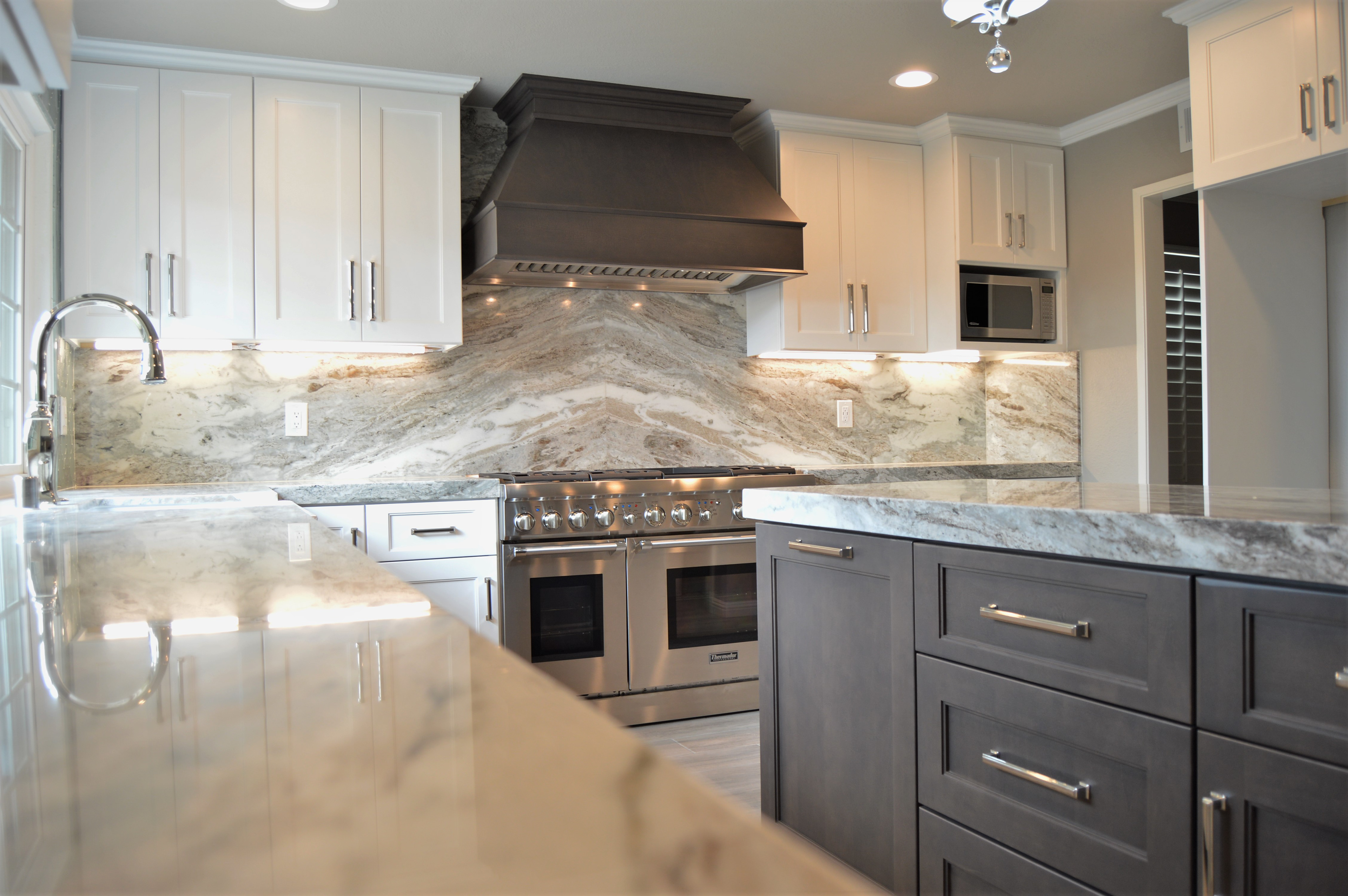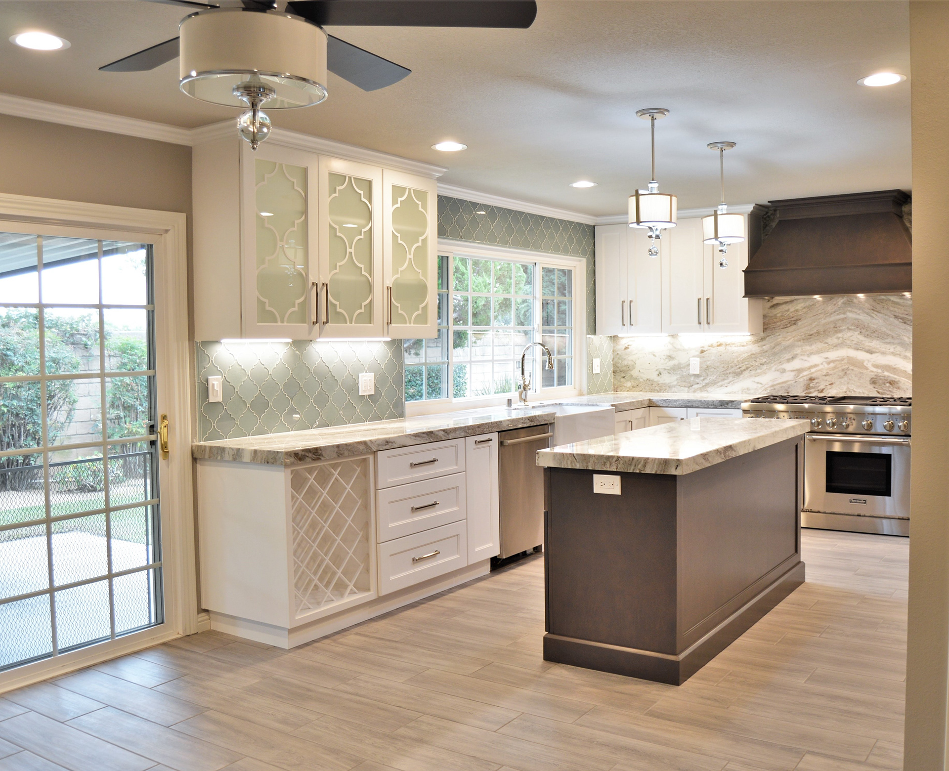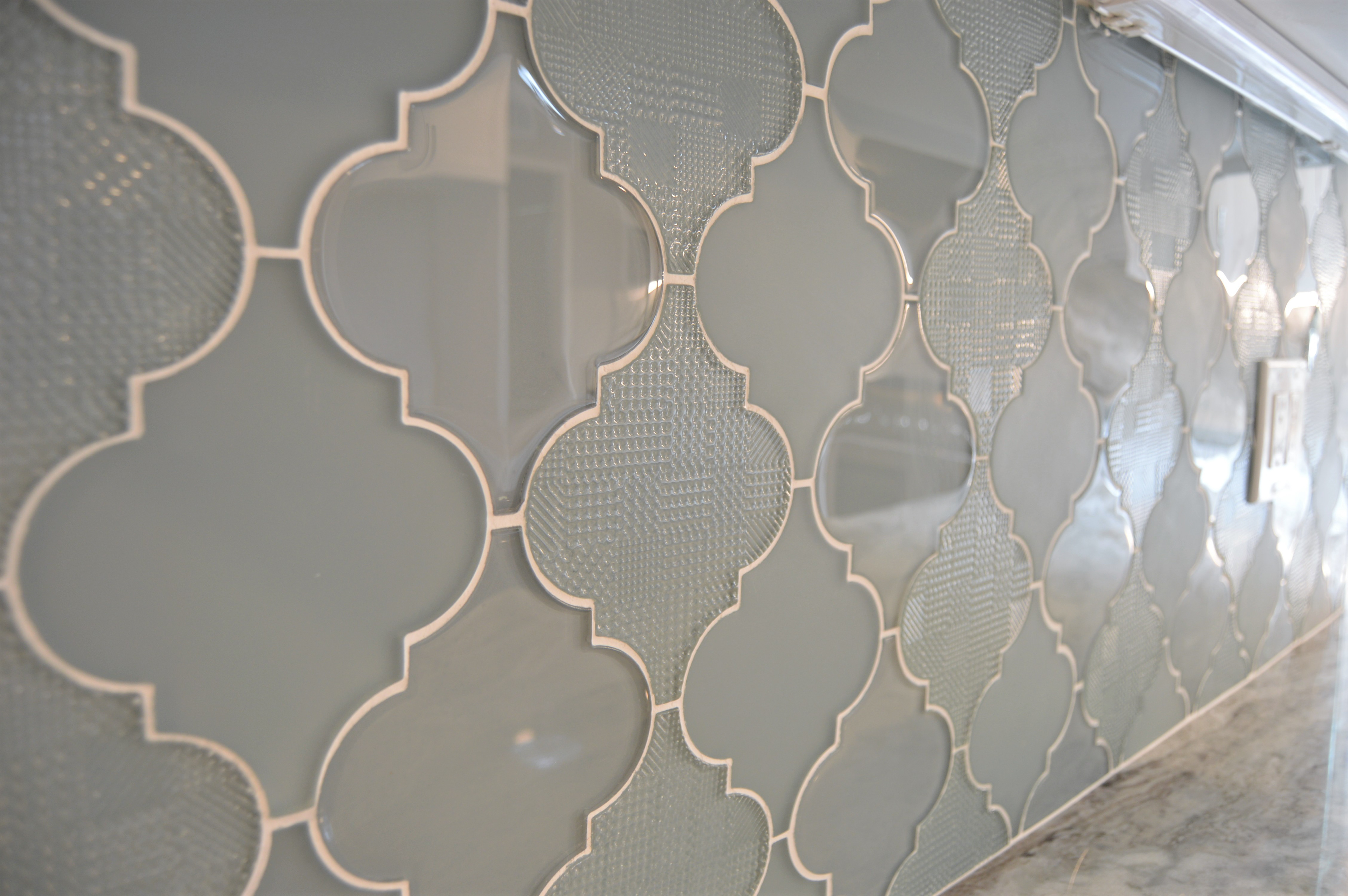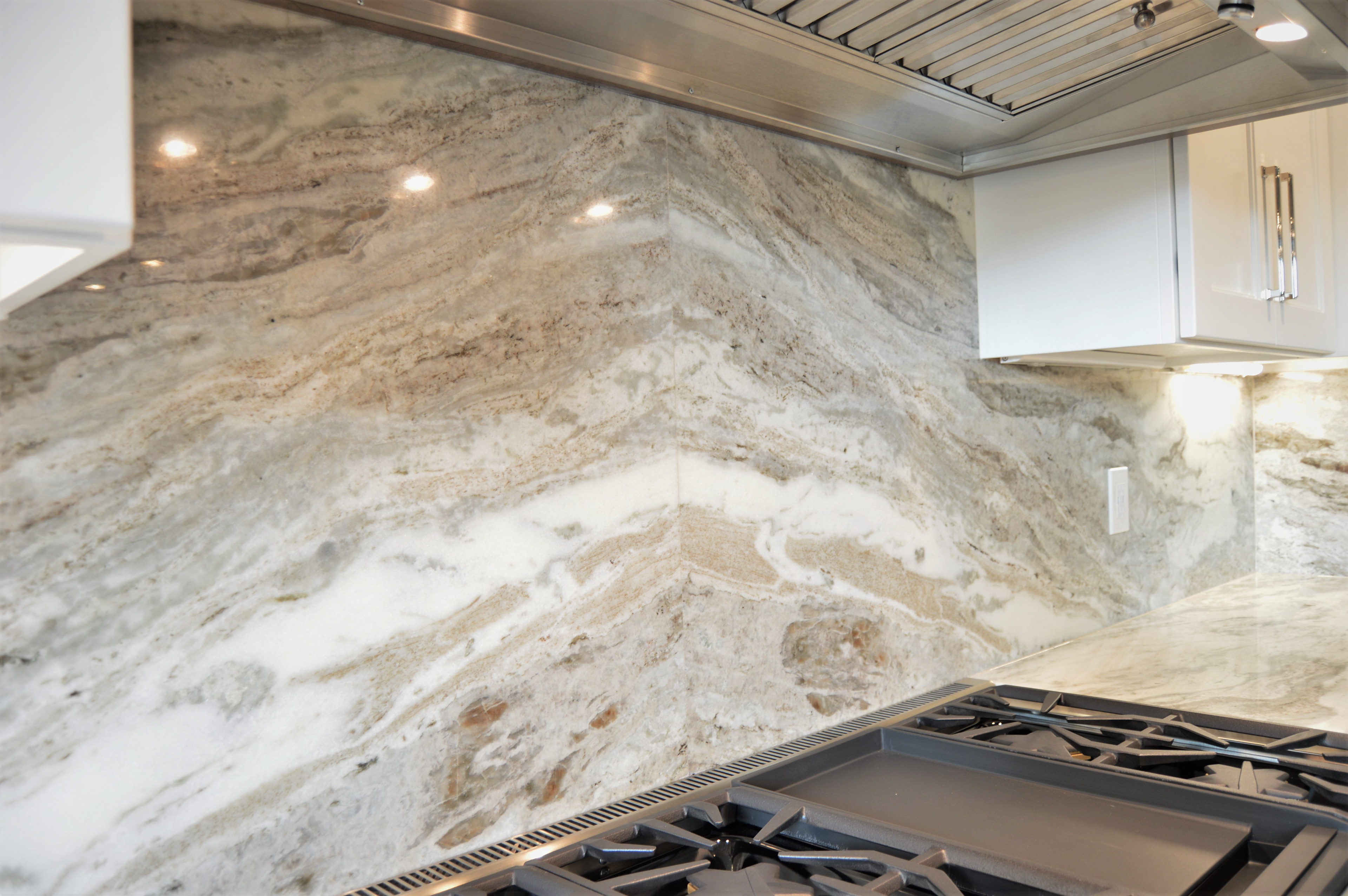 This client loved the sea-foam arabesque backsplash tile, but also liked the idea of installing a herringbone floor. It was explained that too much detail and pattern would be disruptive to the eye and overall cohesiveness of the space. A few renderings were provided before confirming the design. In an effort to simplify the design and provide an elevated look, we suggested a bookmatched marble backsplash on the range wall.