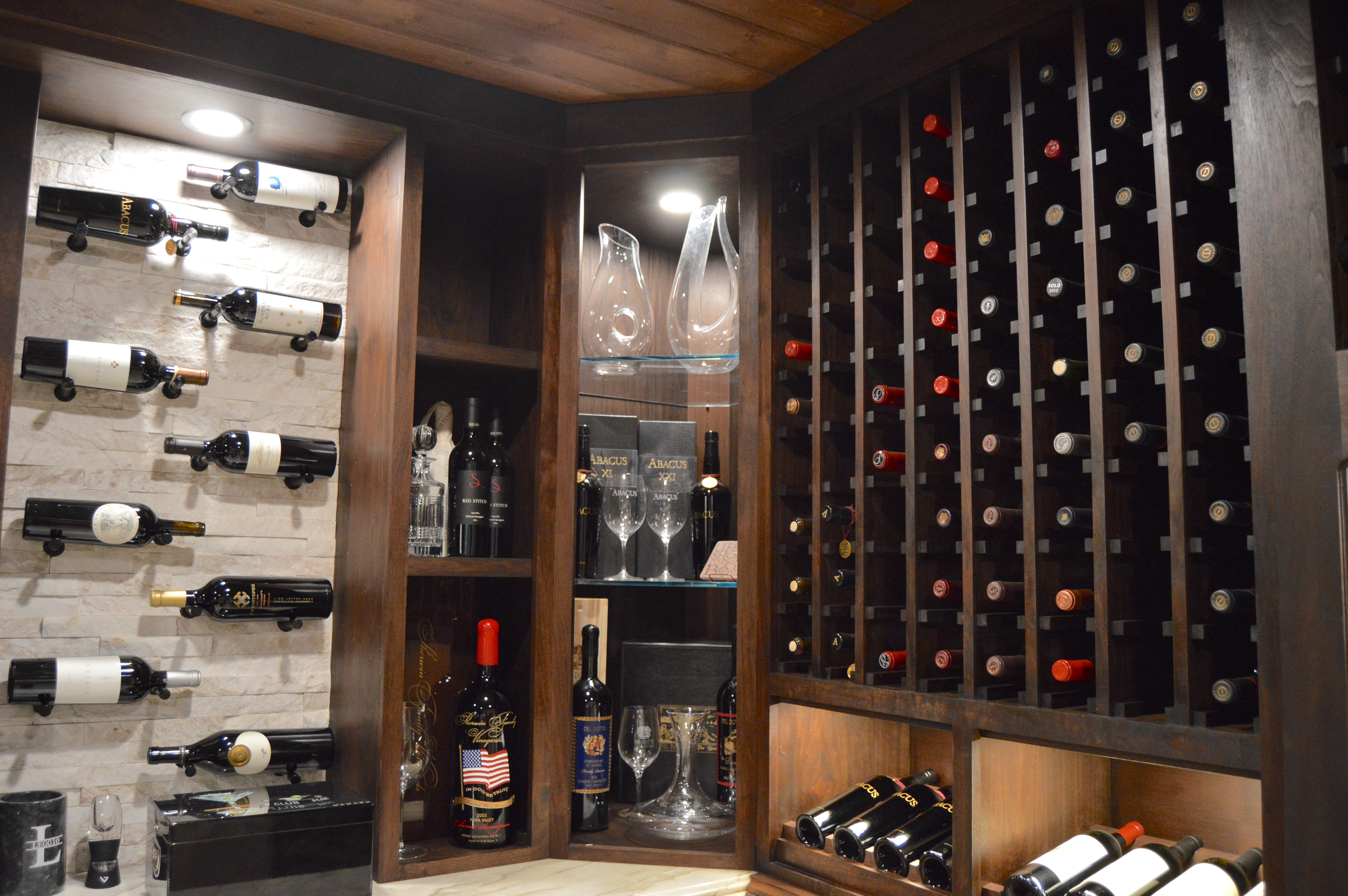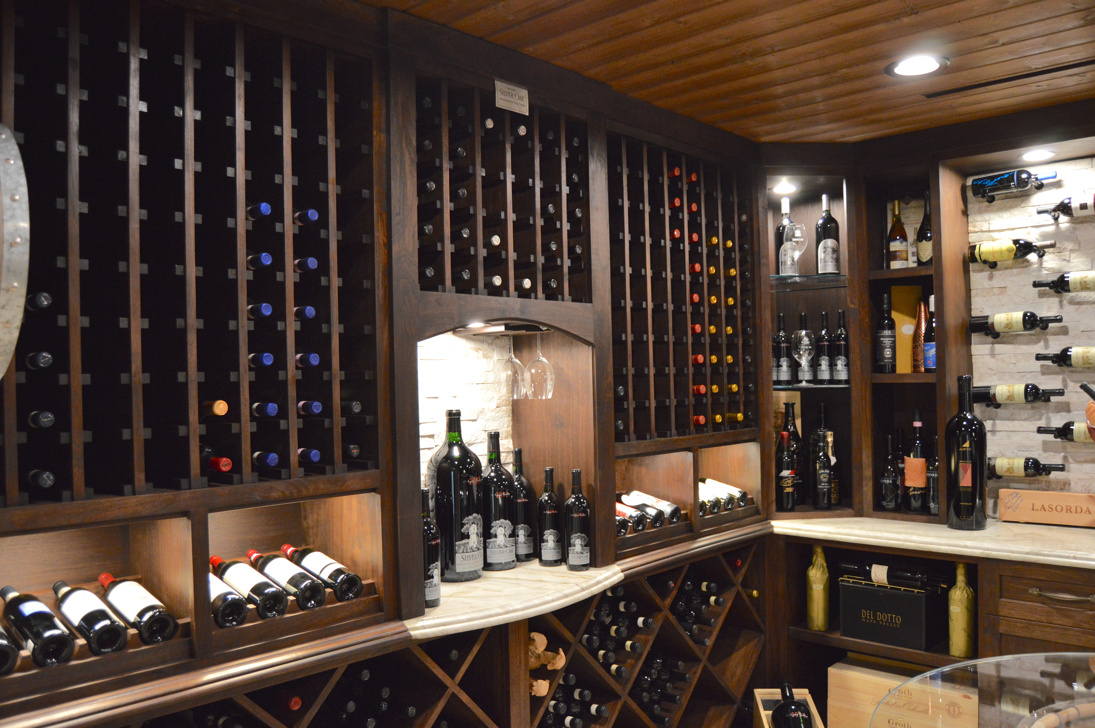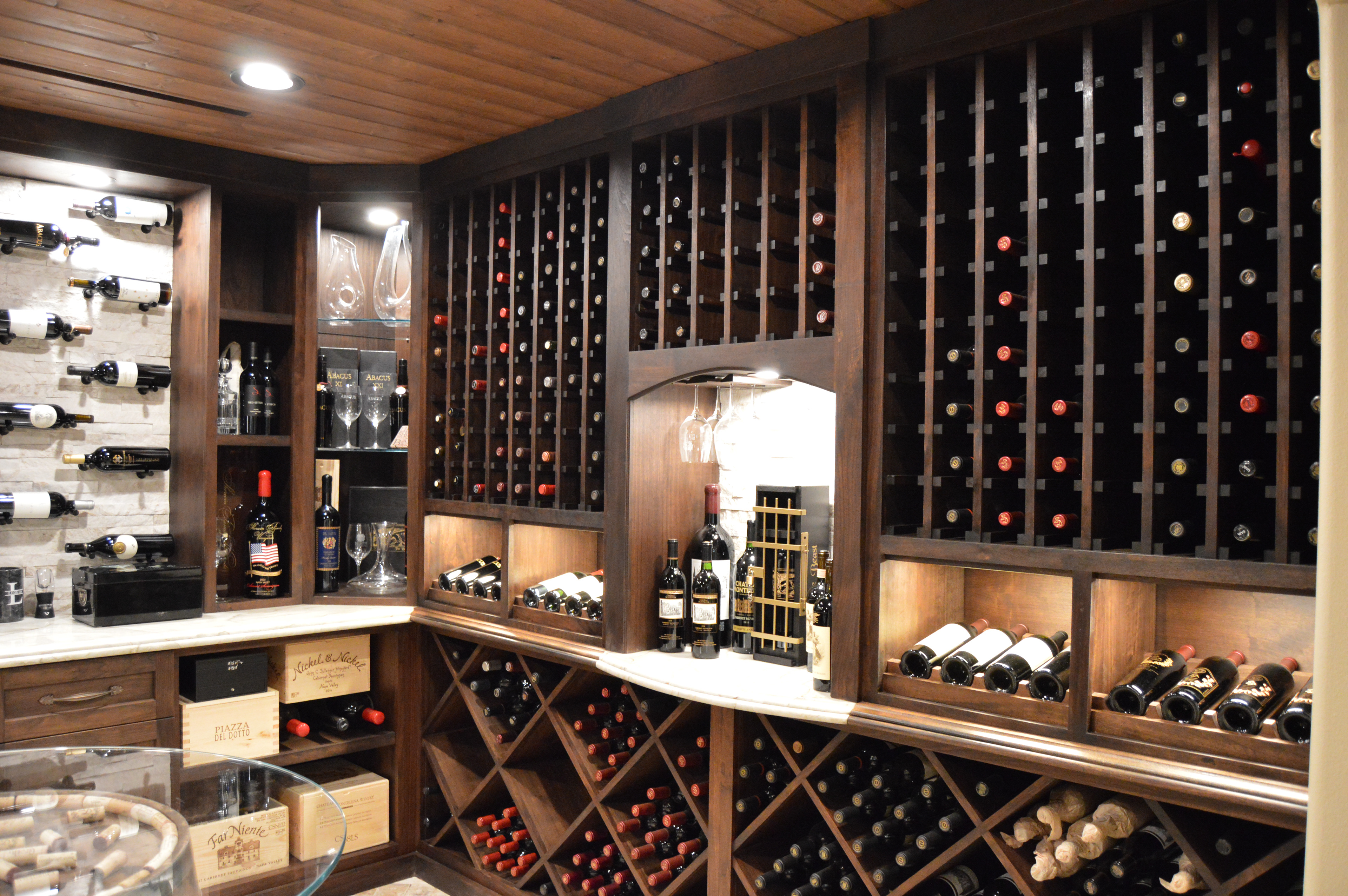 This client decided to transform his dining room into a temperature controlled wine room. He enjoyed the old Italian, rustic wine cellar style, but wanted to integrate modern elements. Dark, rich wood tones were chosen in order to celebrate the classic wine cellar aesthetic. Linear, sleek components were also integrated into this design to complement and enhance the classical design features.