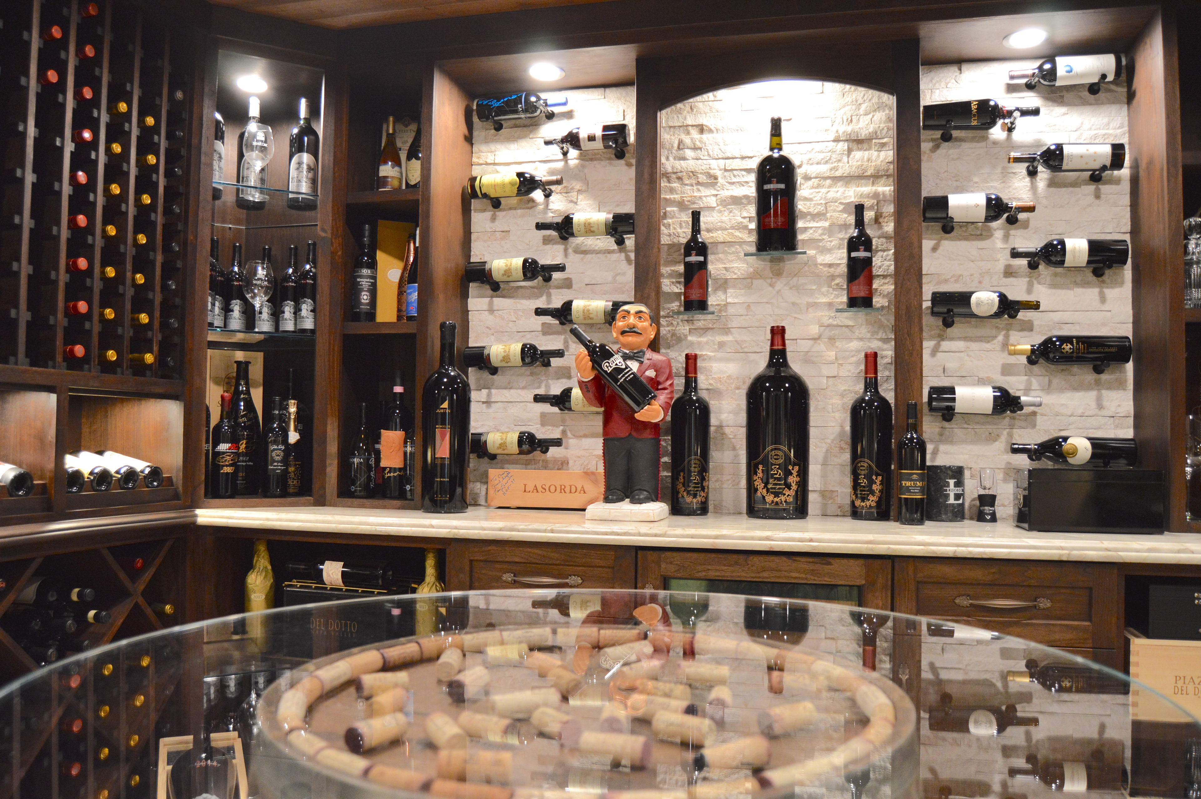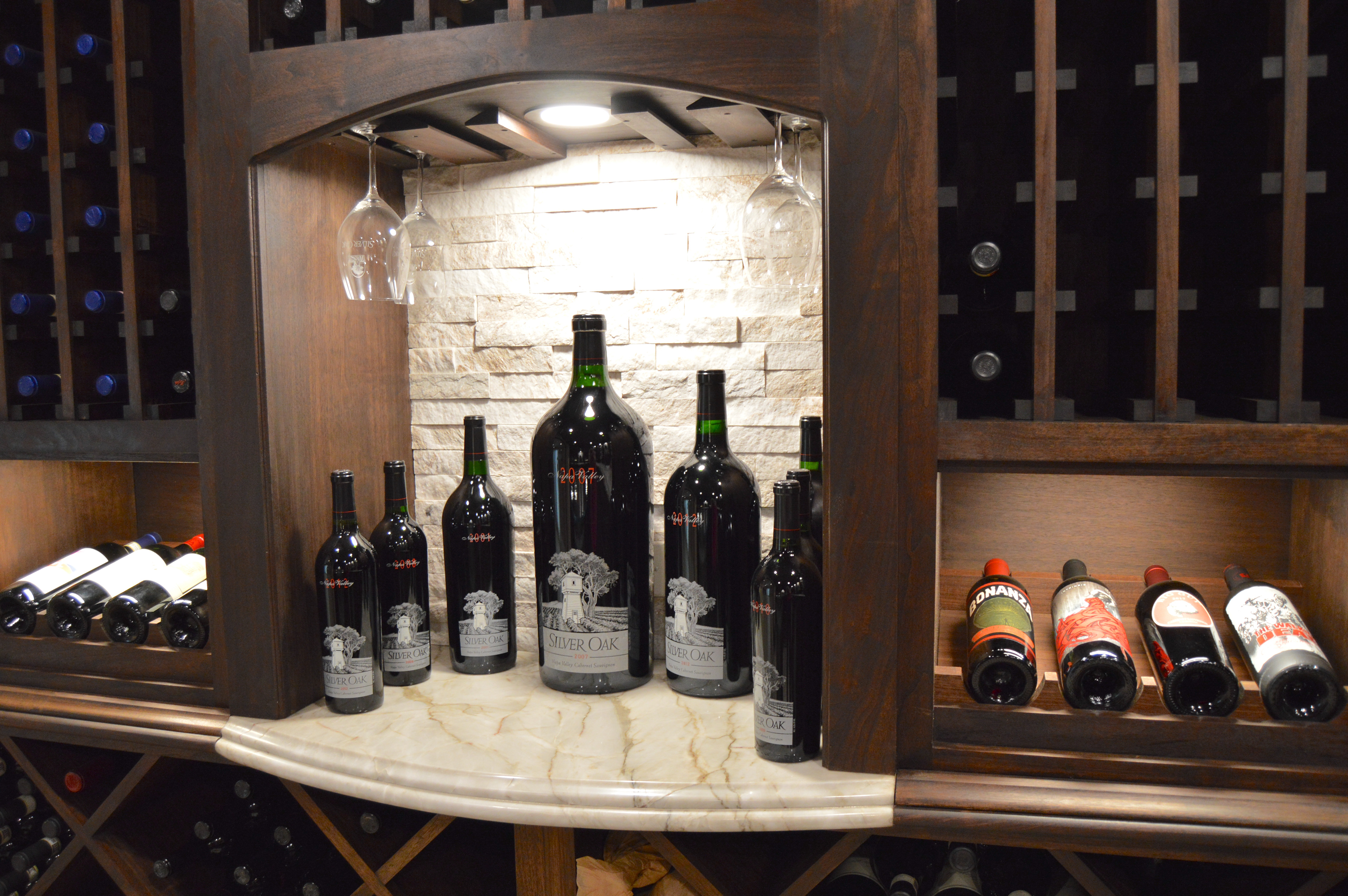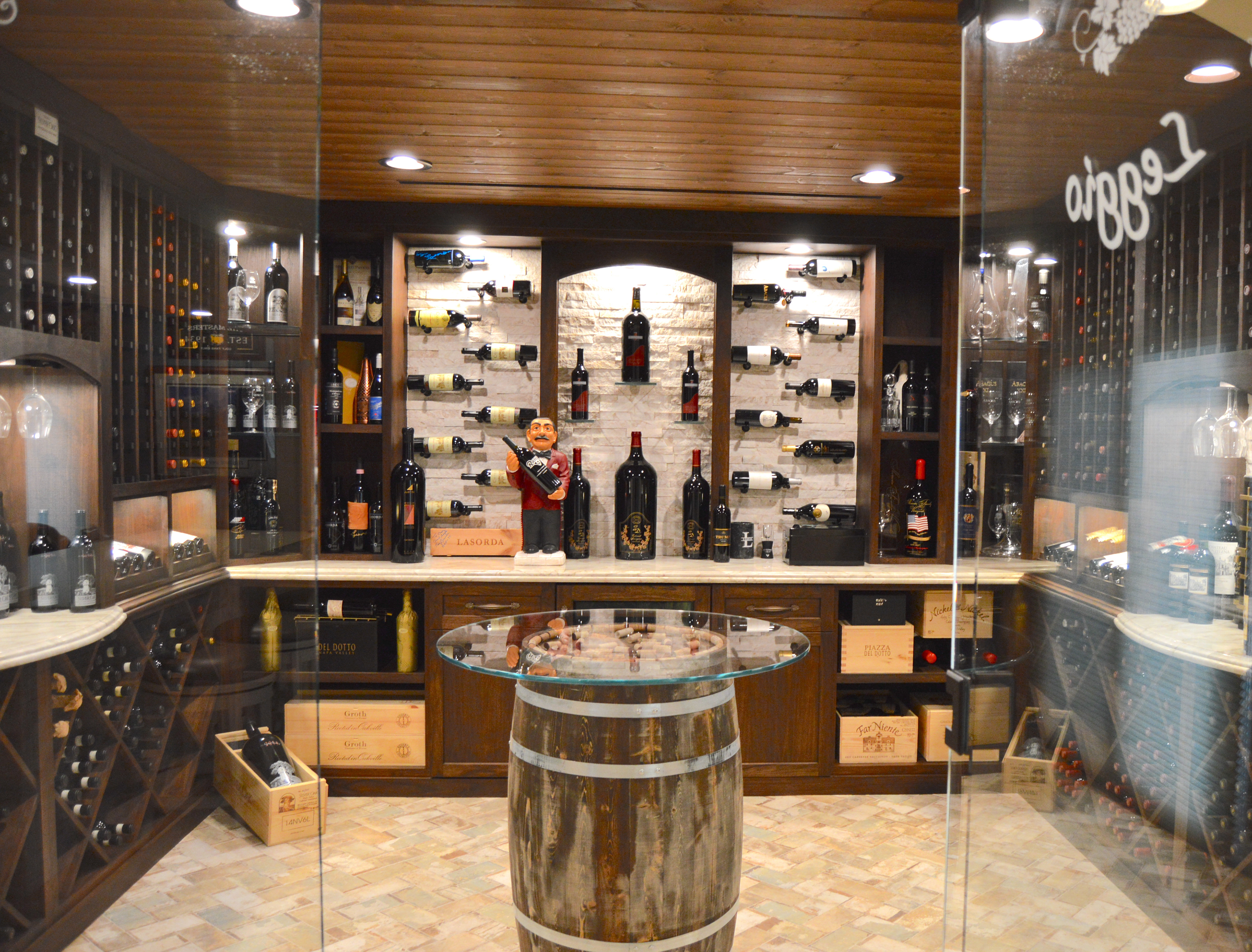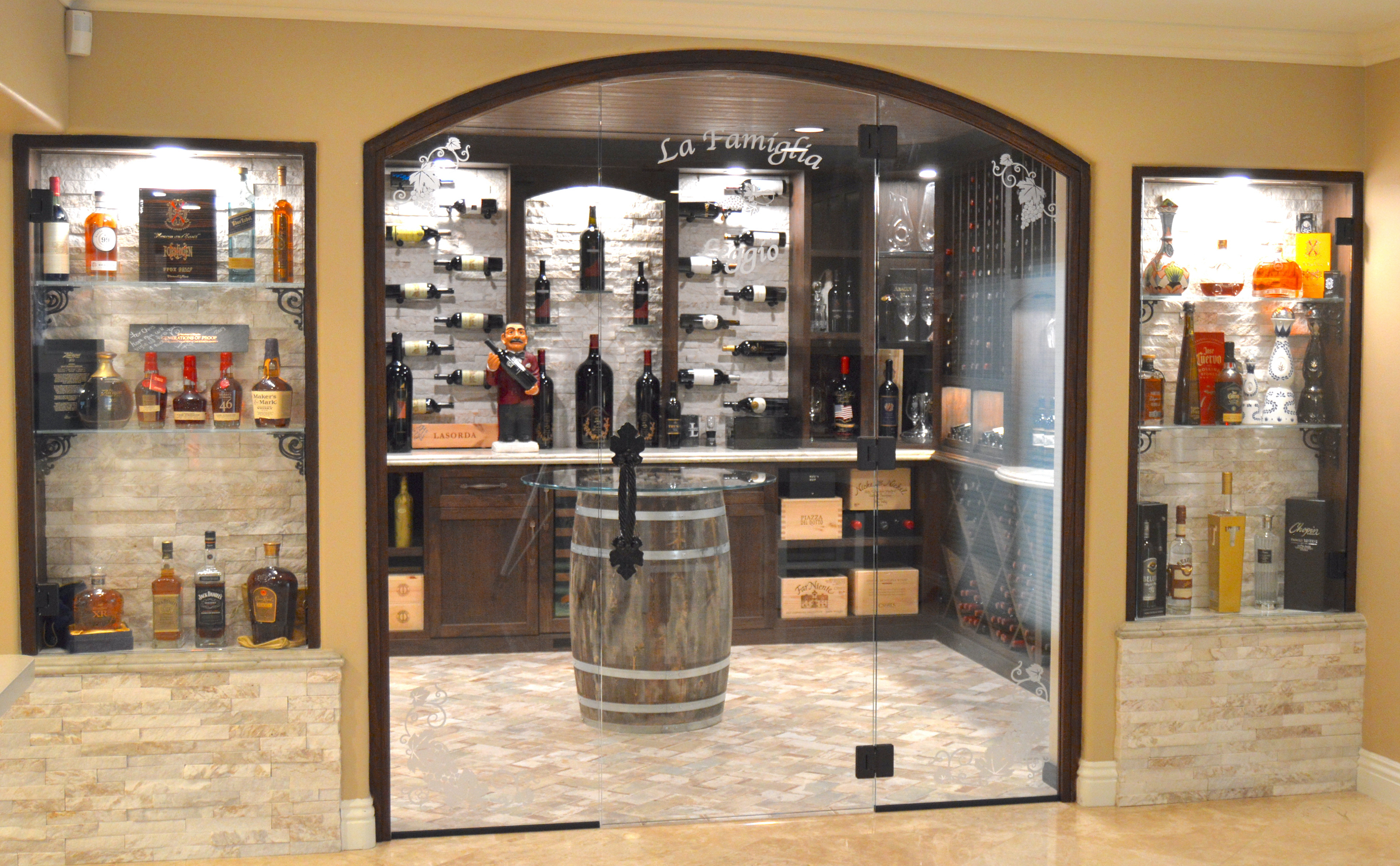 This client decided to transform his dining room into a temperature controlled wine room. He enjoyed the old Italian, rustic wine cellar style, but wanted to integrate modern elements. Dark, rich wood tones were chosen in order to celebrate the classic wine cellar aesthetic. Linear, sleek components were also integrated into this design to complement and enhance the classical design features.